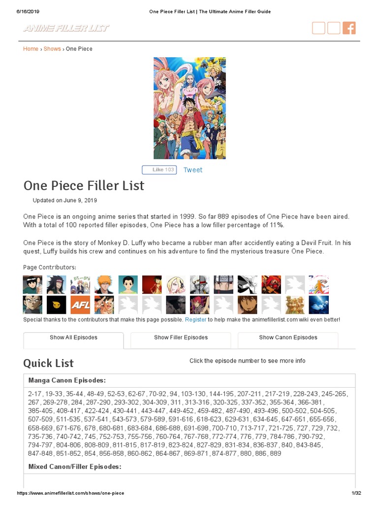 With a total of 99 reported filler episodes One Piece has a very low filler percentage of 10. Mixed cannon are those episodes in which some part. With a total of 99 reported filler episodes One Piece has a very low filler percentage of 10.